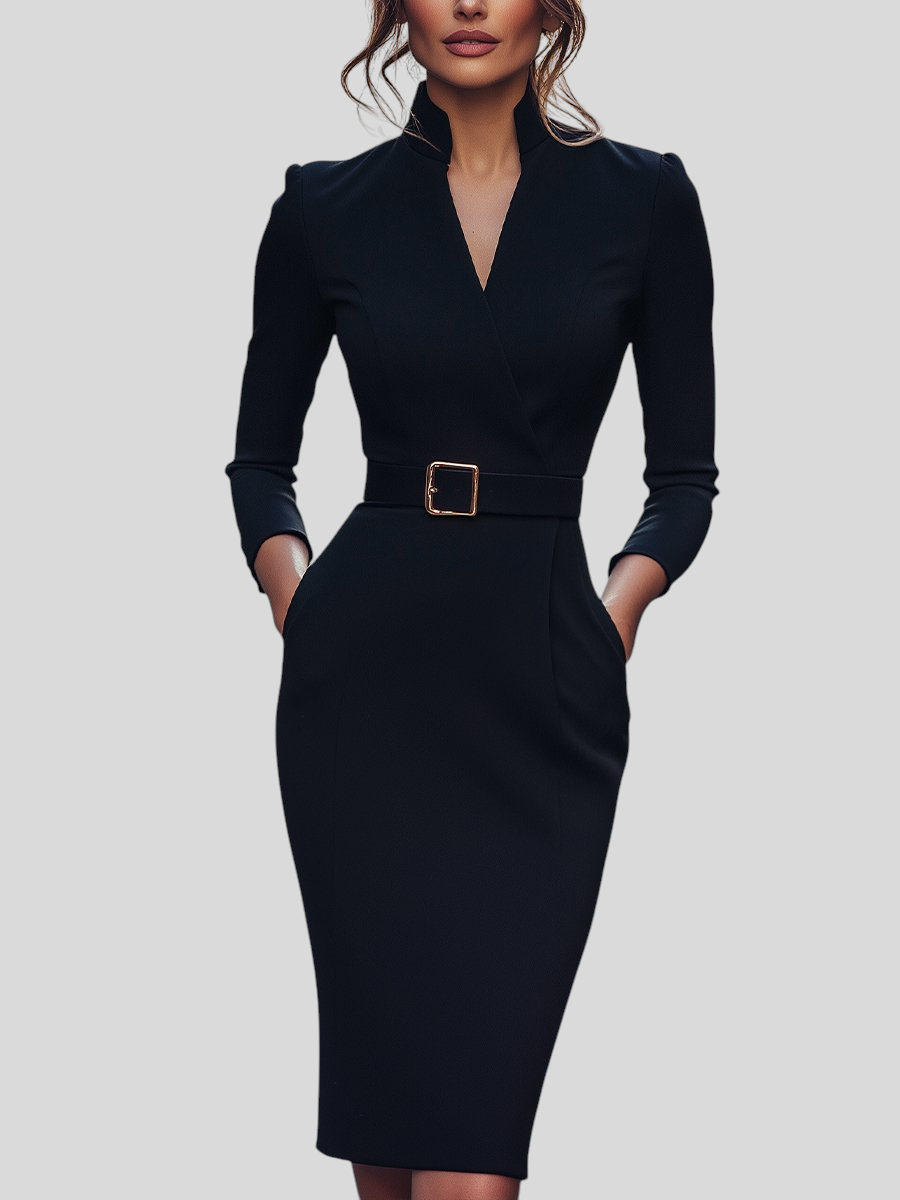 Haljina koja redefinira sofisticiranost. Uski kroj naglašava siluetu s elegancijom, dok strukturirani izrez i remen s kopčom daju dozu autoriteta i modernosti. Savršena za formalne prilike, sastanke ili događaje gdje su stil i samopouzdanje neophodni.