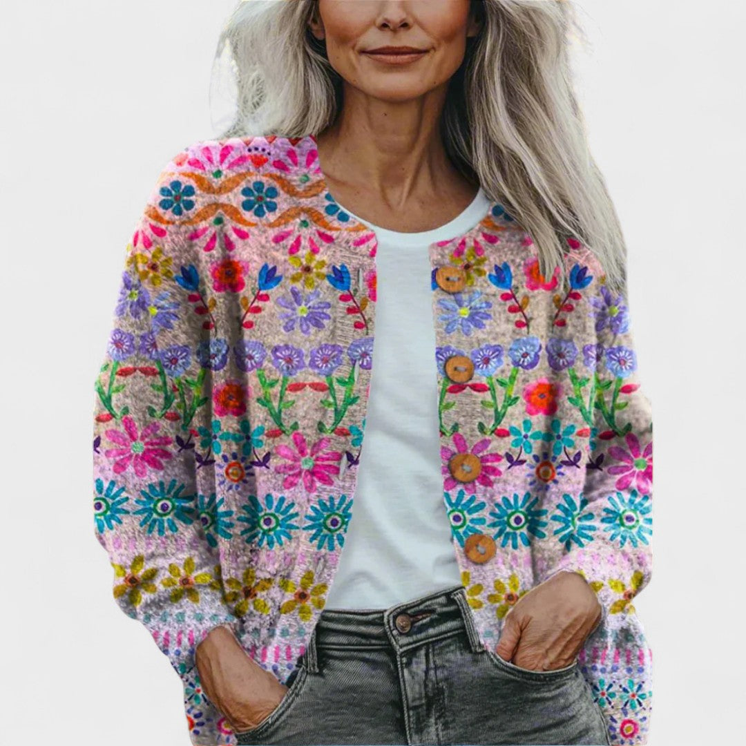 Izrađen od mekanog podstavljenog materijala i ukrašen šarmantnim drvenim dugmadima, ovaj veseli kardigan kombinira toplinu, stil i originalnost u upečatljivom komadu. Savršen za nošenje preko majice ili bluze tijekom vjetrovitih jesenskih dana, ili da te ugrije tijekom svježih noći. Bilo da šetaš među opalim lišćem ili uživaš u kavi na terasi.