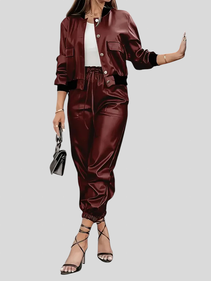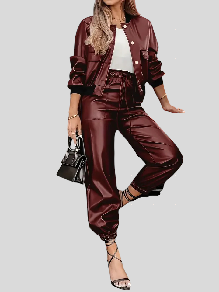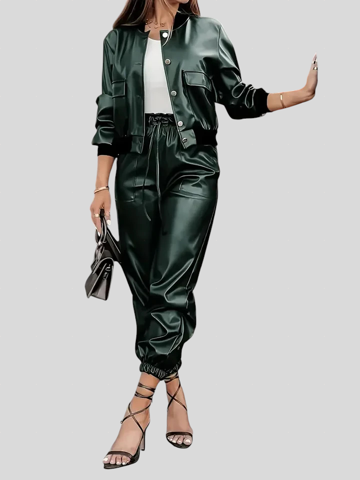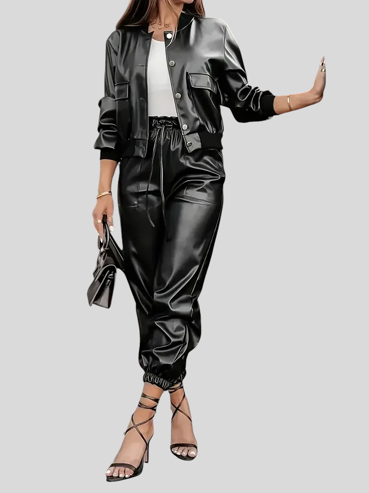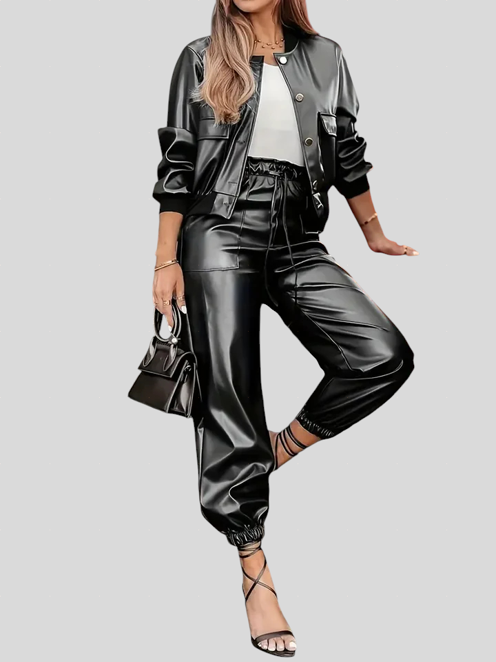 Ovaj kožni komplet stvoren je za žene koje žele spojiti odvažan stil i suvremenu eleganciju. S modernim krojem, praktičnim detaljima i besprijekornom izradom, odiše samopouzdanjem i osobnošću u svakoj prilici. Svestran i upečatljiv, idealan je izbor za one koje žele istaknuti se bez odricanja od udobnosti.