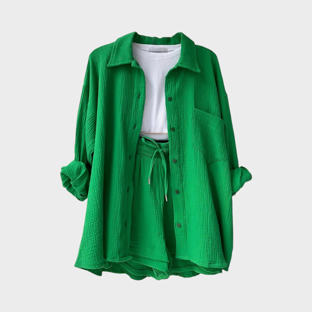 Ovaj svestrani ljetni set nudi savršeni balans između opuštenosti i stila. Sastoji se od lagane košulje i šortsa, idealnog za tople dane. Udoban, praktičan i uvijek u trendu, bit će vaš go-to outfit za casual izlaske, putovanja ili opuštanje kod kuće.