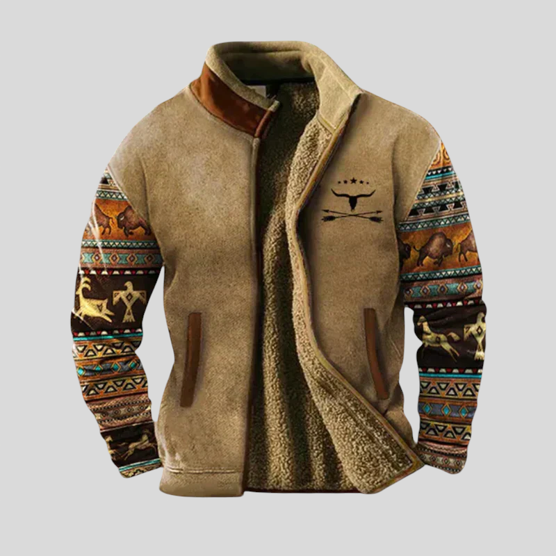 Otkrijte savršeni spoj tradicije i suvremenog dizajna s ovom etničkom jaknom inspiriranom domorodačkom kulturom i western stilom. Rukavi s upečatljivim uzorcima prikazuju simbole poput bizona, konja i tradicionalnih motiva, stvarajući jedinstven i autentičan izgled. Unutarnja sherpa podstava pruža iznimnu toplinu i udobnost, savršenu za hladnije dane. Prednji minimalistički dizajn s motivom bika i ukrštenim strijelama dodaje dodatnu dozu stila i karaktera. Idealna za gradsku šetnju ili boravak u prirodi – ova jakna je izbor za one koji žele istaknuti svoju osobnost.