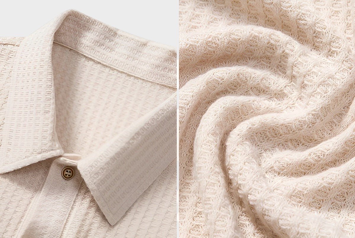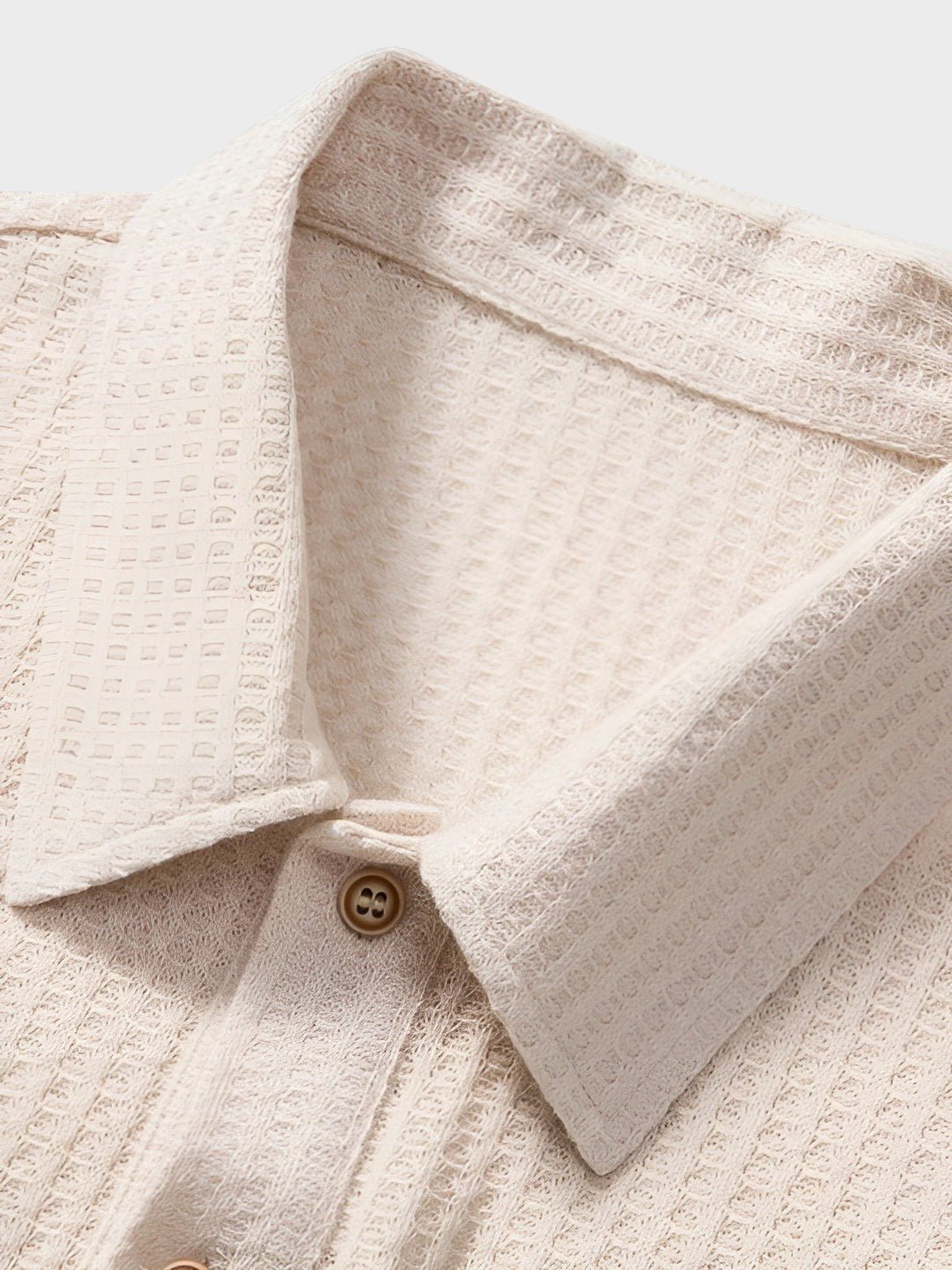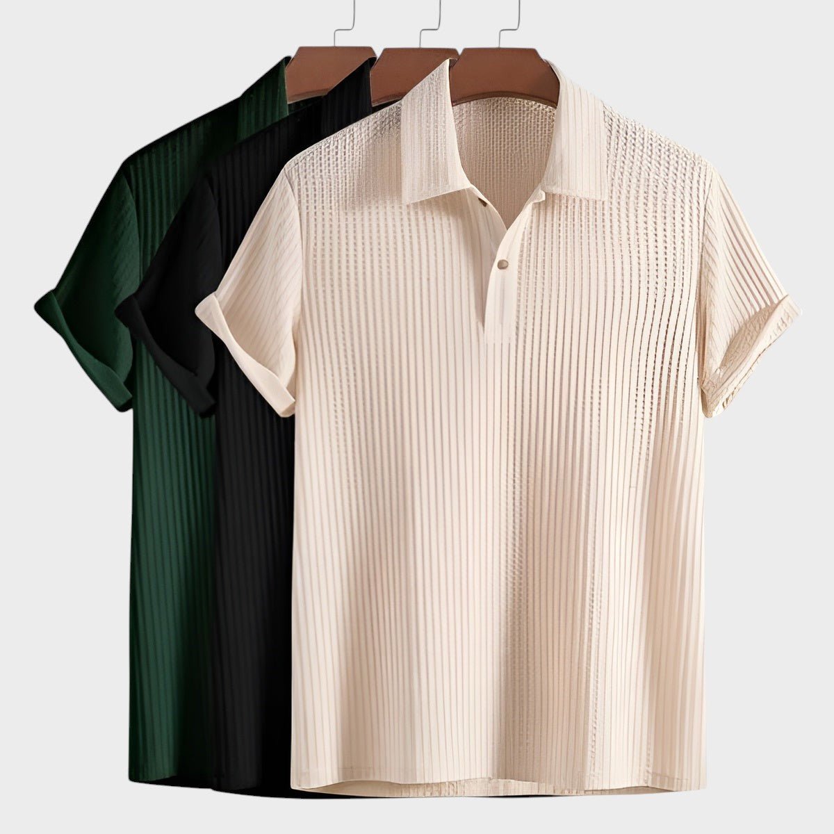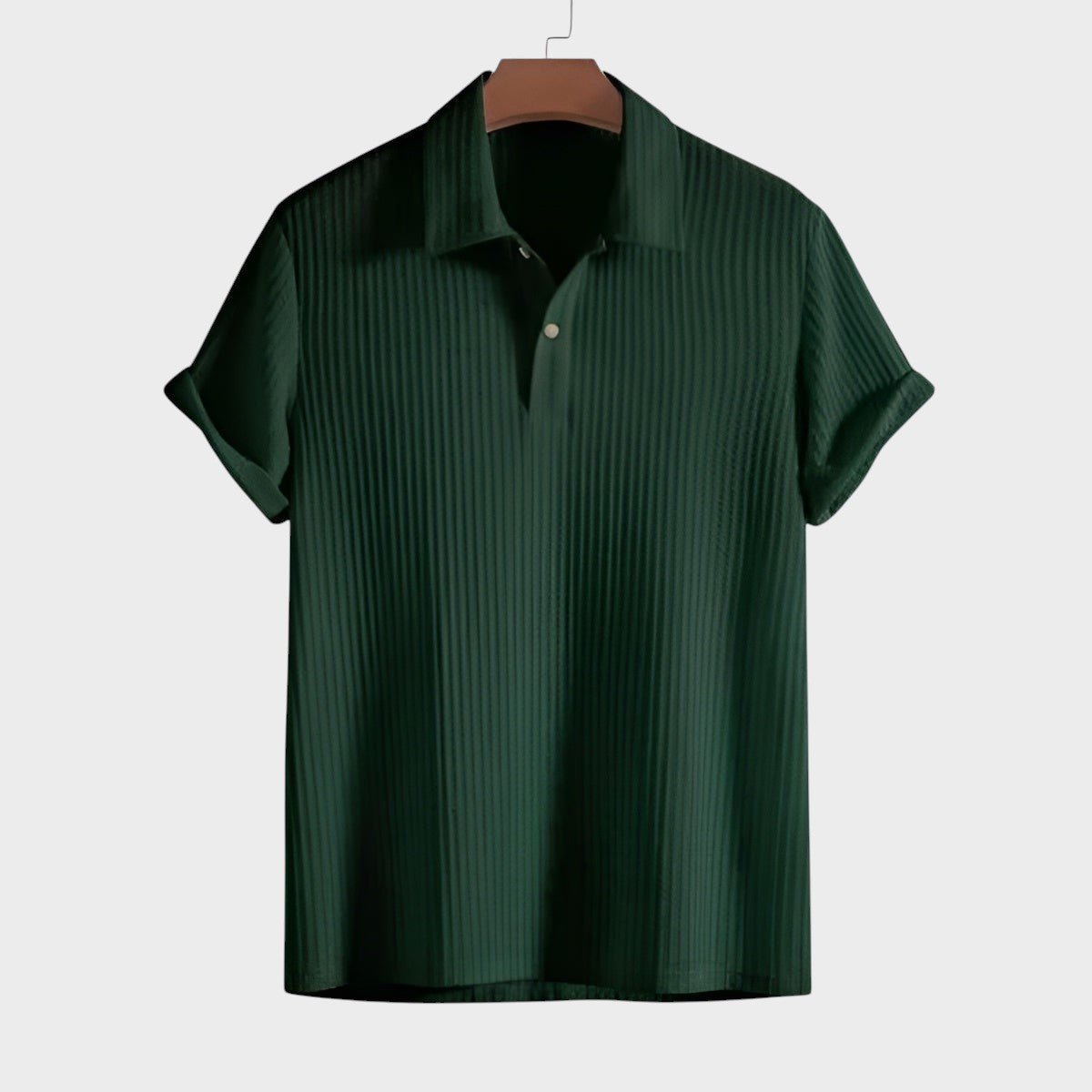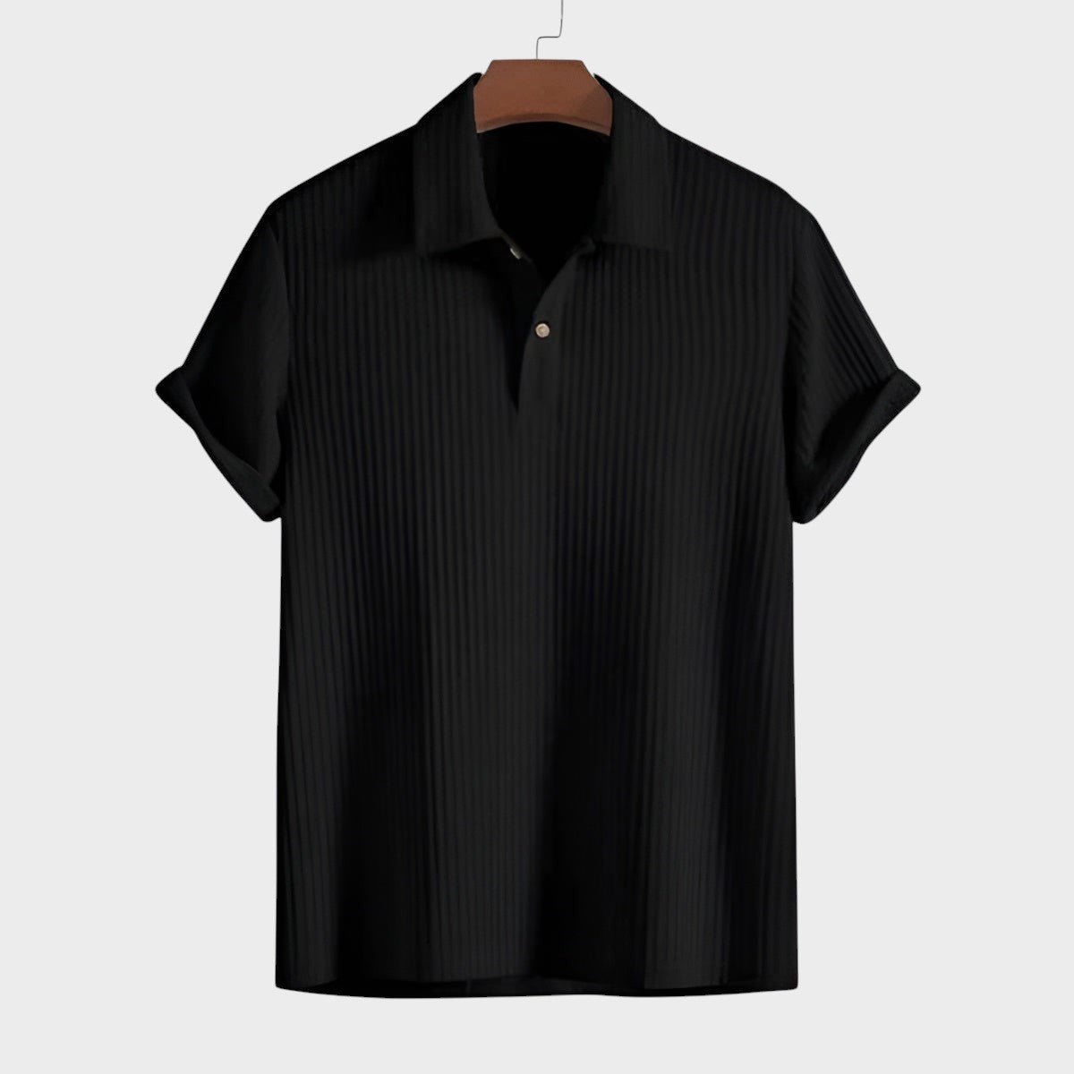 Klasična polo kragna s trostrukim kopčanjem na gumbe i diskretni detalji.